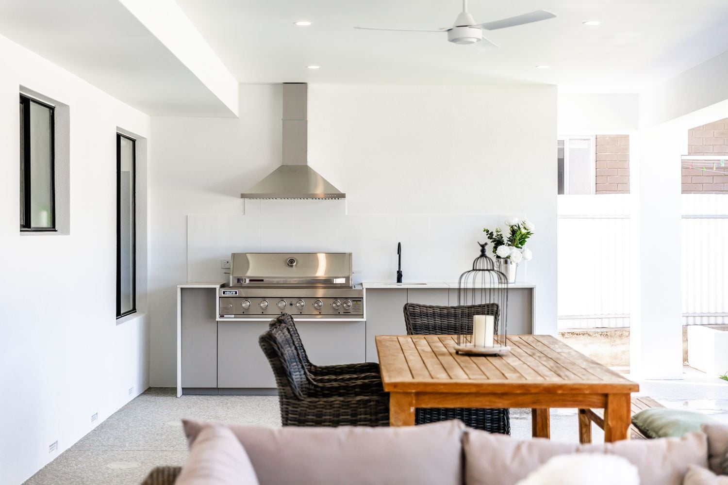 Options to suit a variety of outdoor Alfresco areas, straight or L shaped, free standing (with stone waterfall ends) or in between walls. Designed and manufactured in Australia.