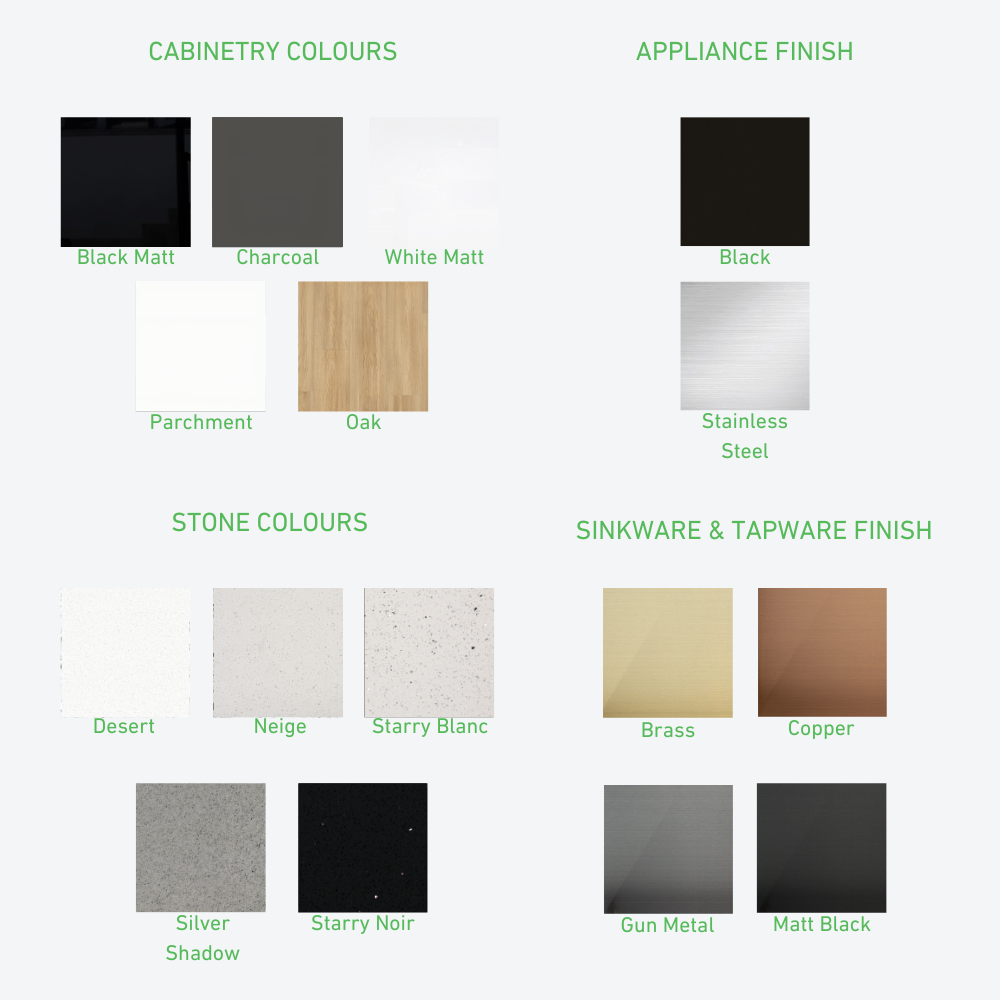 DIY Supply of pre-assembled cabinetry and stone (pre-cut lengths only). Client to organise custom stone cuts (sink and tap), cut outs for vents (LPG Gas) and installation of handles.